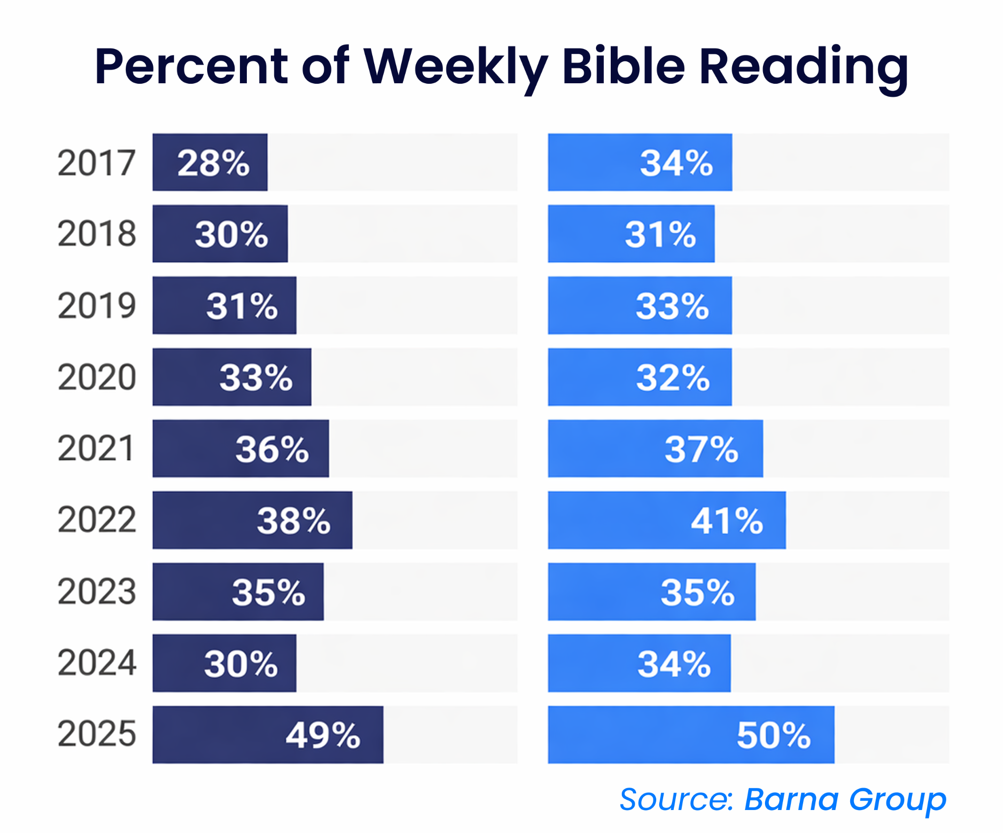 And it’s not just cultural signals. Bible reading in America is surging again. Today, 42% of adults nationwide read Scripture weekly!²